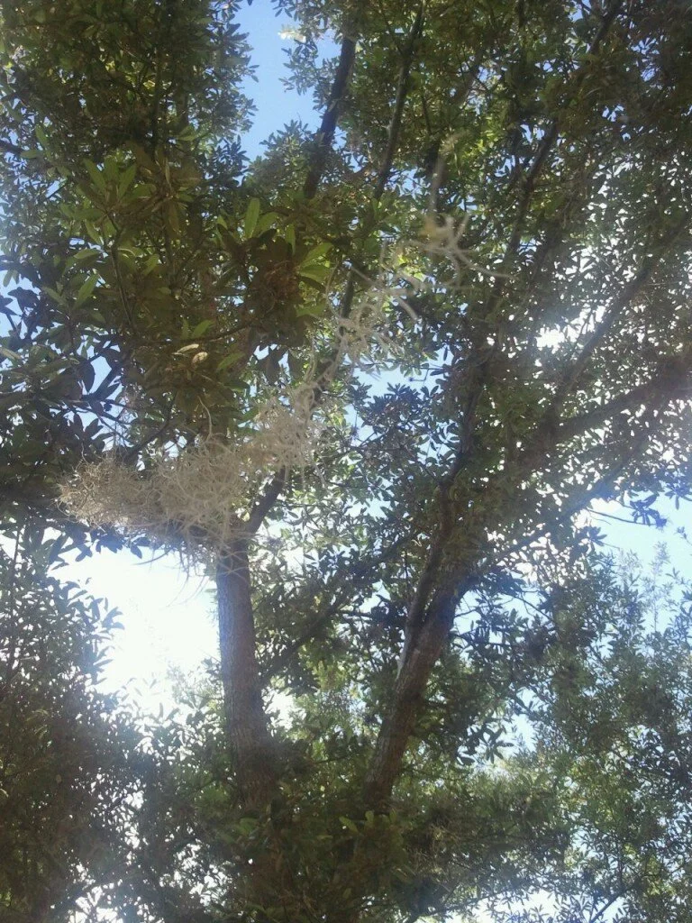While out for a walk this morning, I stopped under a tree and did this. Just then, the stillness in the air was replaced by a sweet gentle breeze. A string of Spanish Moss hanging from a branch directly over my head swayed back and forth and then twirled in circles. Can you see it? It seemed to be dancing with delight. The child in me imagined that the moss somehow noticed my attention.